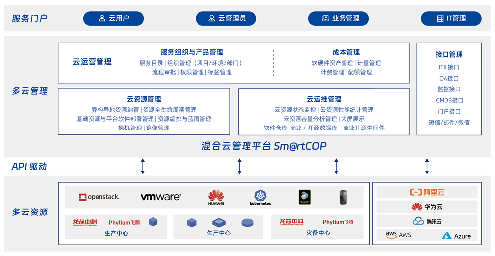 面向各行業(yè)用戶多云資源管理、運維及服務(wù)提供的綜合挑戰(zhàn),提供異構(gòu)異地異芯片多云資源的統(tǒng)一管理、統(tǒng)一運維、統(tǒng)一監(jiān)控及統(tǒng)一運營服務(wù),簡化多云管理復(fù)雜度,提升用戶用云滿意度,釋放云平臺業(yè)務(wù)價值。