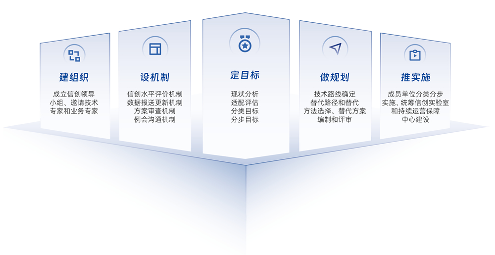 分步推進現(xiàn)狀摸底、分類梳理、實驗評估、路徑選擇、架構(gòu)設(shè)計、方案編制、產(chǎn)品匹配等 環(huán)節(jié),保障信創(chuàng)替代真正落地。