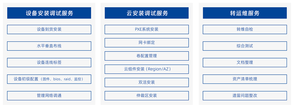 設(shè)備上架加電、布線插纖及標(biāo)簽黏貼、服務(wù)器產(chǎn)品初始化、網(wǎng)絡(luò)產(chǎn)品開局、系統(tǒng)推送及各批次網(wǎng)絡(luò)割接。