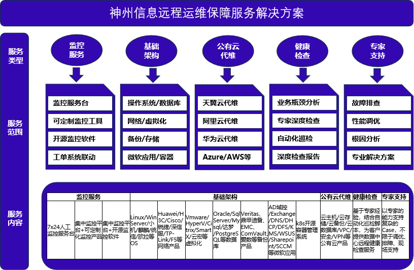 集中監控平臺、可定制化監控工具、開源監控軟件、安全堡壘機、ITSM工單系統等,構成遠程運維保障服務矩陣。