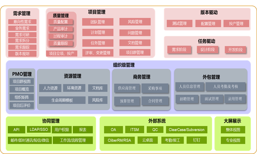 • 提供了兩個全景視圖和一個閉環:需求的全景視圖;項目的全景視圖;與運維系統集成形成從需求到運維,運維事件轉需求的閉環。