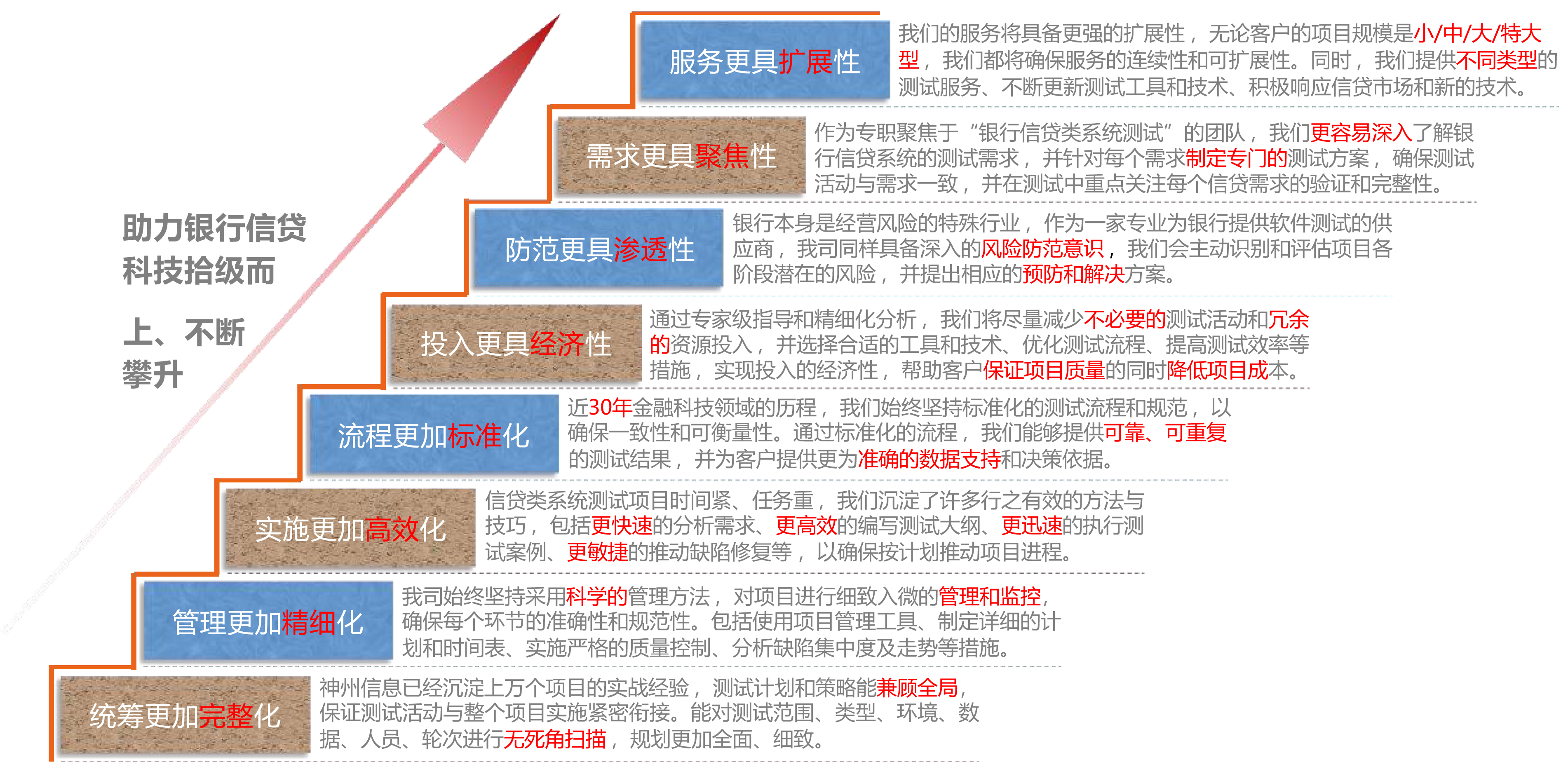 我們將以快速響應能力為導向,及時處理銀行在信貸類系統(tǒng)測試過程中遇到的問題和需求變,以確保項目的成功實施、符合客戶預期。